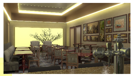 O destaque do projeto fica por conta da iluminação cênica. No forro uma grande moldura de canto revestida de Di-Noc madeirado contorna todo o salão e esconde a iluminação de led, camuflada por um difusor de acrílico, criando uma luz homogênea e geral. Uma das paredes do restaurante é inteira iluminada, e cria um efeito de luz difusa em todo o espaço. Executada com tela tensionada, essa parede tem imagem da silhueta de uma árvore criando a sensação de pôr do sol no horizonte. Esse mesmo efeito de iluminação se repete no pórtico iluminado que separa a área das mesas da área de bar.