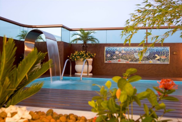 No caso de piscinas localizadas com mais distanciamento da construção principal, podemos usar o recurso de um pergolado de concreto ou madeira que recebe toda a tubulação necessária para o funcionamento da cascata. O mesmo sistema pode ser usado em piscinas construídas ao lado de muros de arrimo usados também como função de solário. Em apartamento, a opção é uma cascata de inox, instalada na borda da piscina, conferindo charme e movimento ao espelho d’água.