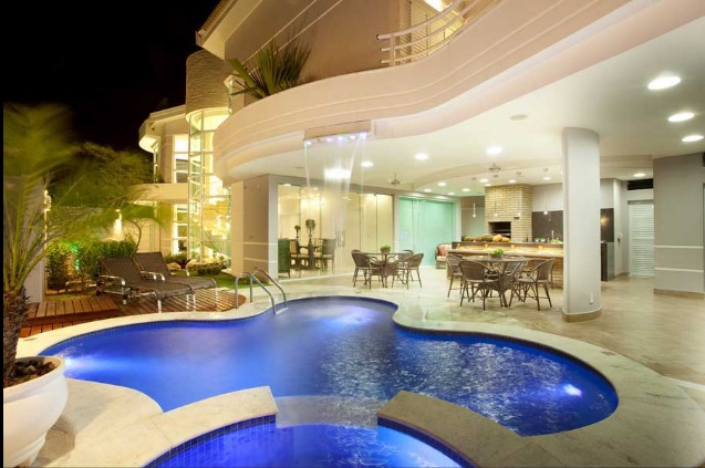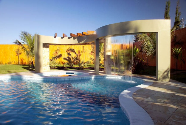 Elas podem ser projetadas de várias formas, tudo depende da área onde será construída e da preferência dos proprietários. No caso de residências com dois pavimentos, é possível construir a piscina ao lado da varanda e utilizar a laje como ponto de queda da água.