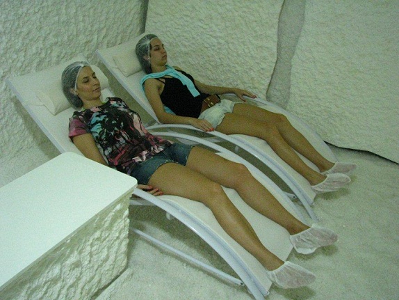 Crianças, jovens, adultos e idosos entram na sala de sal, sentam-se em cadeiras e, como se estivessem tomando sol, respiram as partículas do sal puro que limpam as vias respiratórias, melhoram a pele e as alergias e ainda aliviam sintomas de doenças emocionais e psicológicas. A terapia é também excelente para fumantes.