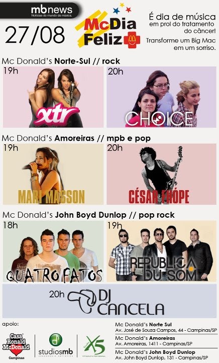 Neste sábado, 27/08, acontece nas lanchonetes McDonald´s o McDia Feliz, evento que tem como objetivo doar parte das vendas de Big Mac para o Centro Boldrini e a Casa Ronald McDonald de Campinas/APACC.