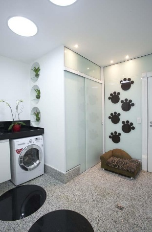 O arquiteto Aquiles Nicolas Kílaris tem recebido cada vez mais pedidos para incluir em apartamentos e casas um cantinho especial para os bichinhos. Em um de seus projetos de apartamento, a área da lavanderia foi escolhida para acomodar a cama do animal de estimação e a parede ao lado recebeu adesivo de pegadas para ambientar o espaço.
