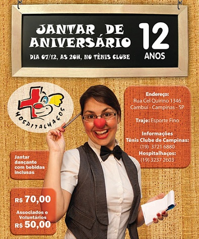 A ONG Hospitalhaços realiza, nesta quarta, 07/12, o Jantar Beneficente 12 anos de Hospitalhaços. O evento acontece no Tênis Clube de Campinas e tem início às 20h.