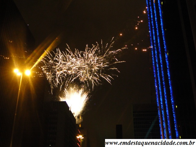 No momento da virada a avenida foi iluminada por um show de fogos de artifício de cerca de 15 minutos e chuva de papel prateado, com 5 milhões de confetes metalizados.